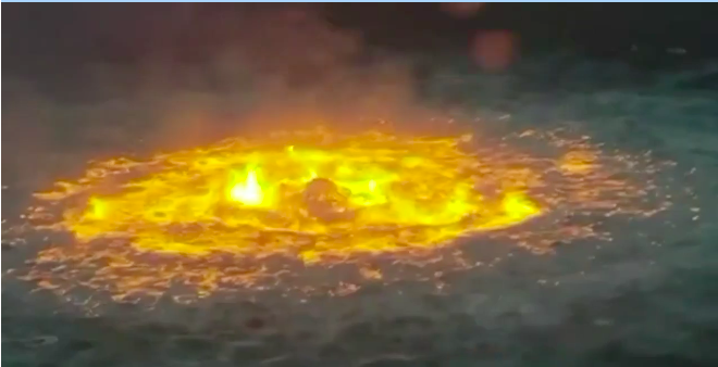 Video ghi lại vụ việc cho thấy một quả cầu lửa xoay tròn trên biển, trong khi các tàu chữa cháy hoạt động xung quanh để khống chế ngọn lửa.