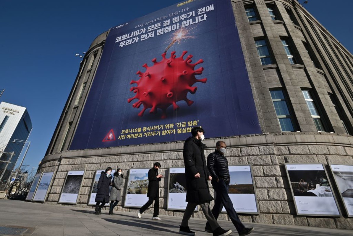 Hình ảnh tuyên truyền phòng chống dịch Covid-19 tại tòa thị chính Seoul. Ảnh: AFP.