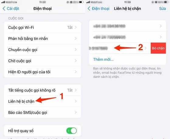 Trong trường hợp cần bỏ cần, hãy truy cập vào Settings (cài đặt) - Phone (điện thoại) -> Blocked Contacts (Liên hệ bị chặn) và vuốt từ phải qua trái để chọn Unblock (Bỏ chặn).