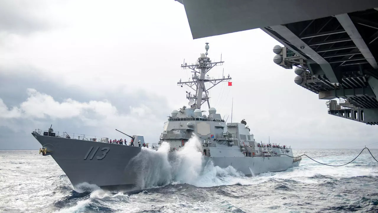 Ảnh minh họa: Khu trục hạm mang tên lửa dẫn đường USS John Finn (DDG 113) tiếp cận tàu sân bay USS Theodore Roosevelt (CVN 71) ngày 14/01/2021. USS Theodore Roosevelt (CVN 71) - Petty Officer 1st Class Christop