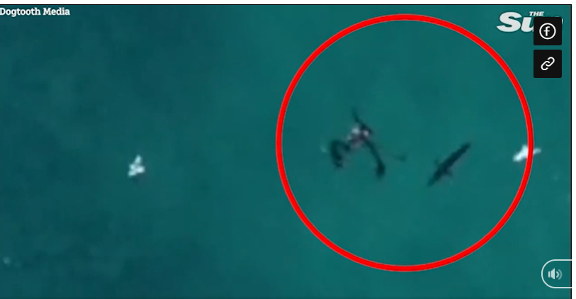 Trong cảnh quay do flycam ghi lại, một con cá mập - được cho là loài cá mập Mako - bắt đầu lao vào ngư dân, người đang lặn để săn cá, sau khi bị thu hút bởi số mồi nhử mà ngư dân này mang theo.