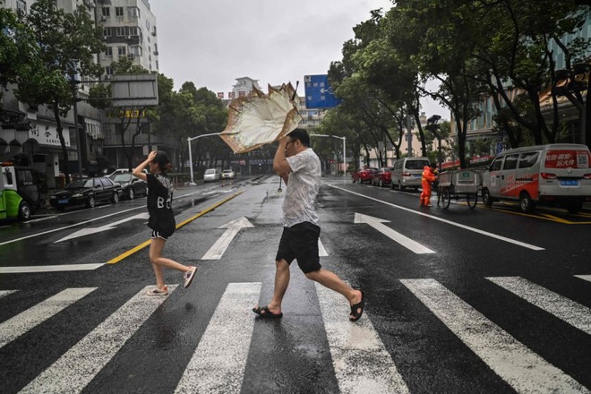 Gió lớn thổi bay ô của người đi đường ở Ninh Ba (Ảnh: AFP).