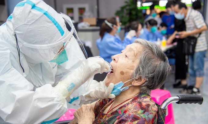 Nhân viên y tế lấy mẫu xét nghiệm Covid-19 cho một người cao tuổi ở Vũ Hán, tỉnh Hồ Bắc hôm 3/8. Ảnh: Xinhua.