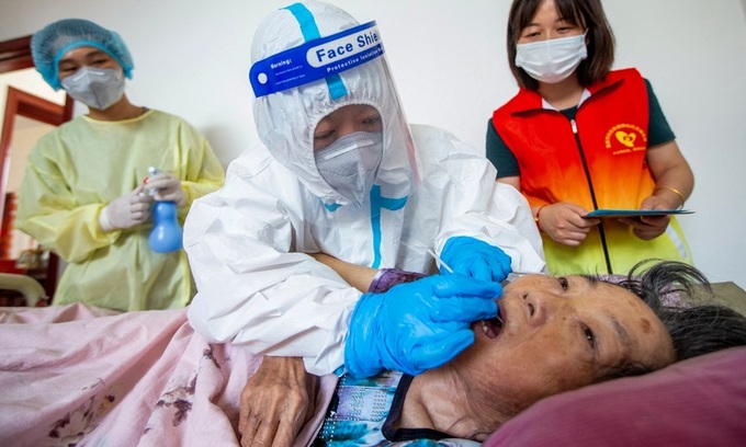 Nhân viên y tế lấy mẫu xét nghiệm Covid-19 cho một cụ bà tại tỉnh Giang Tô, Trung Quốc hôm 8/8. Ảnh: AFP.