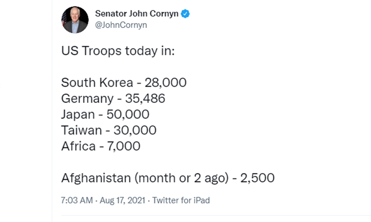 “Quân đội Mỹ hiện có 28.000 quân ở Hàn Quốc, 35.468 ở Đức, 50.000 ở Nhật Bản, 30.000 ở Đài Loan, 7.000 ở châu Phi và 2.500 ở Afghansitan (cách đây một hoặc hai tháng)”, ông Cornyn viết.