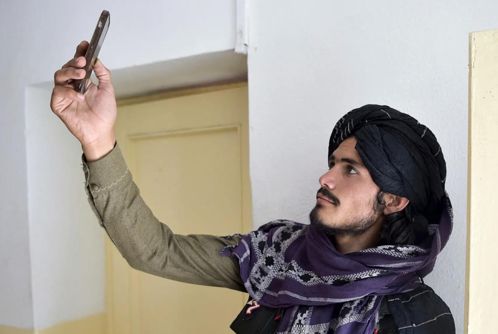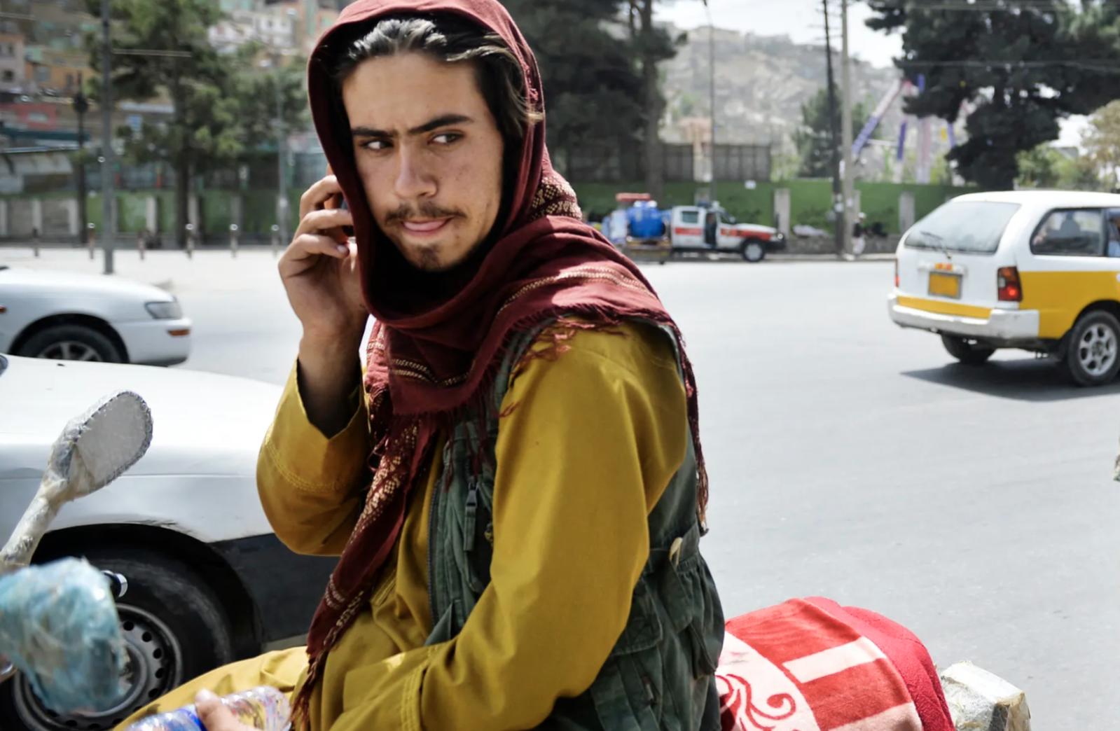 Tay súng Taliban sử dụng điện thoại bên đường phố ở Kabul ngày 18/8/2021. Ảnh: AFP/Getty Images