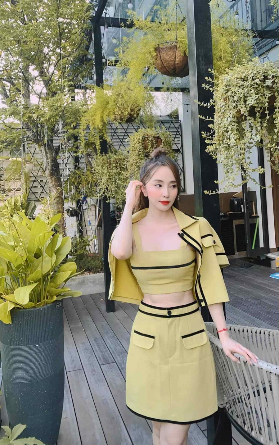 Diễn viên Quỳnh Nga sở hữu thân hình gợi cảm nhờ chăm chỉ tập luyện kết hợp với chế độ ăn uống khoa học. Cô chọn cho mình set váy áo đồng bộ mang sắc vàng chanh với những đường viền đen tạo điểm nhấn.