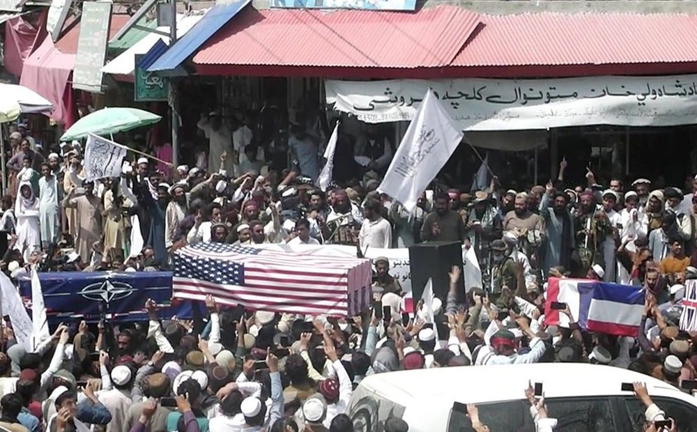 Đám đông mang theo những chiếc quan tài phủ cờ NATO, Mỹ và Vương quốc Anh trong một đám tang giả trên một con phố ở Khost, Afghanistan ngày 31/8/2021. Ảnh: Reuters / ZHMAN TV