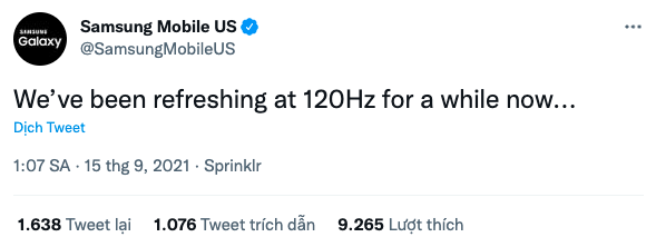 Sau khi Apple công bố iPhone 13, Samsung đăng thông điệp trên Twitter rằng họ đã đưa màn hình có tần số quét 120 Hz lên điện thoại từ lâu.