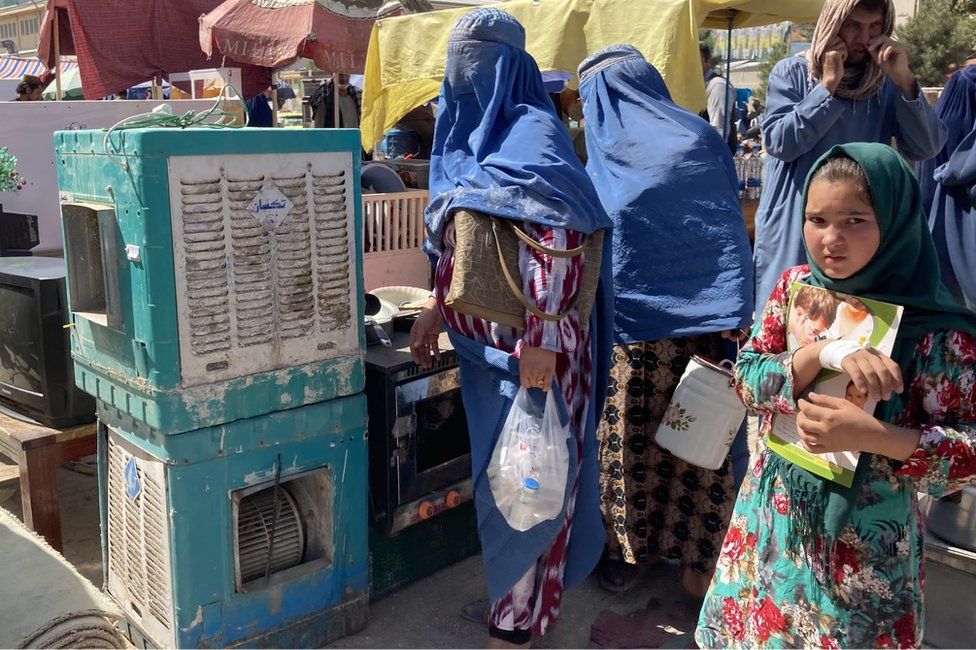 Một cô bé ở chợ đồ cũ ở Mazar-i-Sharif, Afghanistan. Nhiều người Afghanistan buộc phải bán đồ đạc của họ để kiếm sống. Ảnh: BBC