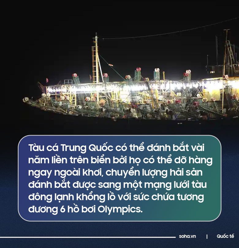 Tàu cá Trung Quốc có thể đánh bắt vài năm liền trên biển bởi họ có thể dỡ hàng ngay ngoài khơi, chuyển lượng hải sản đánh bắt được sang một mạng lưới tàu đông lạnh khổng lồ với sức chứa tương đương 6 hồ bơi Olympics. Những tàu dầu cung cấp nhiên liệu giá rẻ thì được sự trợ cấp của chính phủ Trung Quốc.