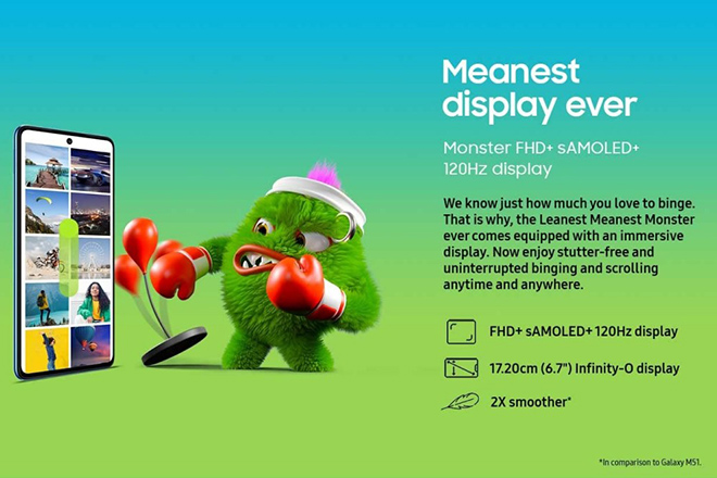 Galaxy M52 5G được trang bị màn hình Infinity-O Super AMOLED 6,7 độ phân giải FHD+ với tần số quét 120 Hz.