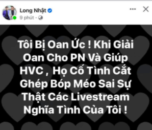 Trước hành động của kẻ xấu, anh cảm thấy rất oan ức. "Tôi bị oan ức! Khi giải oan cho Phi Nhung và giúp Hồ Văn Cường, họ cố tình cắt ghép bóp méo sai sự thật các livestream nghĩa tình của tôi" - Long Nhật viết.
