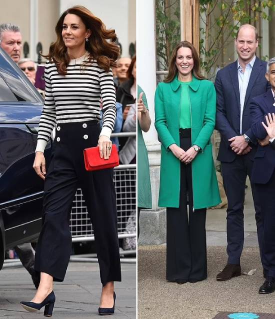 Kate khi mang theo ví trong một sự kiện năm 2019 (trái) và khi không cầm theo phụ kiện này trong hoạt động cùng chồng vào tháng trước. Ảnh: Rex/PA