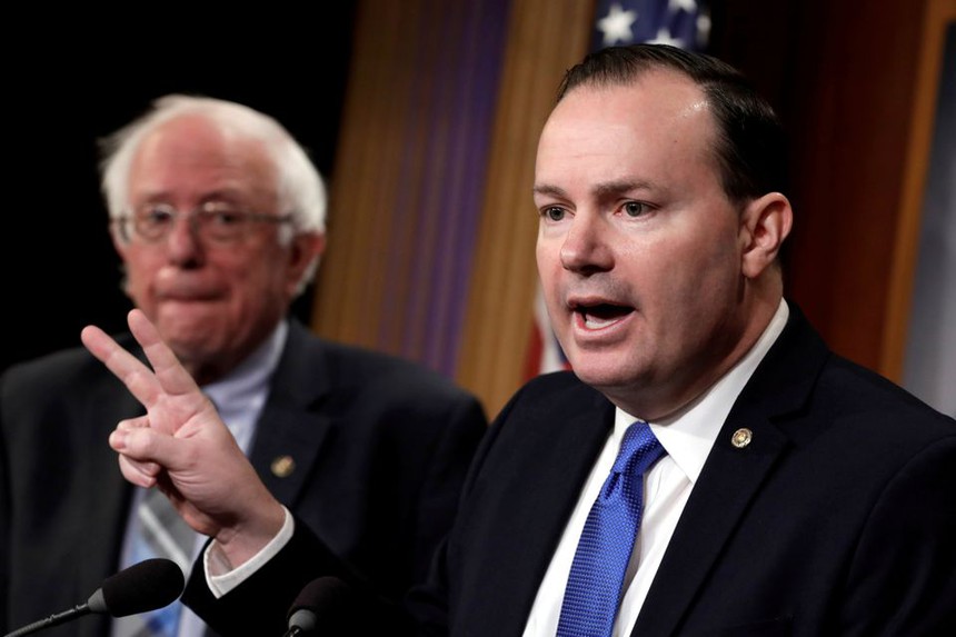 Ông Mike Lee (phải) và ông Bernie Sanders phát biểu tại Điện Capitol tháng 1/2019. Ảnh: Reuters.