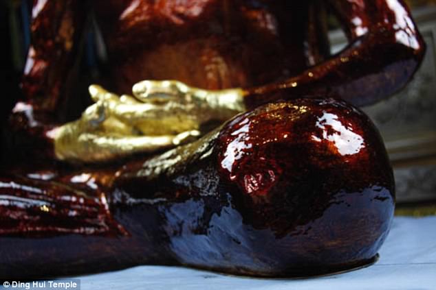 Xác ướp nhà sư đáng kính đă được đánh vecni trước khi mạ vàng tại chùa Dinghui.