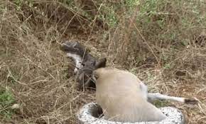 Do bị mắc kẹt, con trăn không thể tiếp tục nuốt cũng như nhả con mồi. Sau một thời gian quằn quại vì đau đớn, con trăn cuối cùng cũng thoát ra khỏi cặp sừng của linh dương và bò vào bụi rậm để chạy trốn.