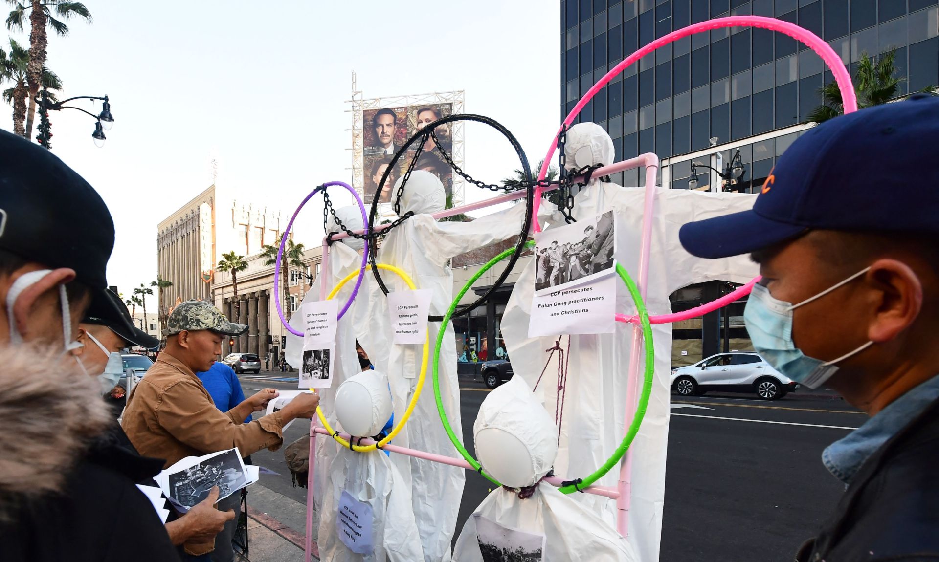 Nhóm biểu tình ở Hollywood treo hình nộm đại diện cho những người bị chính quyền Trung Quốc đàn áp. (Hinh: Frederic J. Brown/AFP via Getty Images)