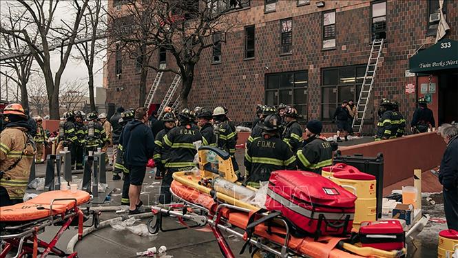 Lính cứu hỏa làm nhiệm vụ tại hiện trường vụ hỏa hoạn nghiêm trọng ở khu Tremont, quận Bronx, thành phố New York (Mỹ) ngày 9/1/2022. Ảnh: WABC/TTXVN