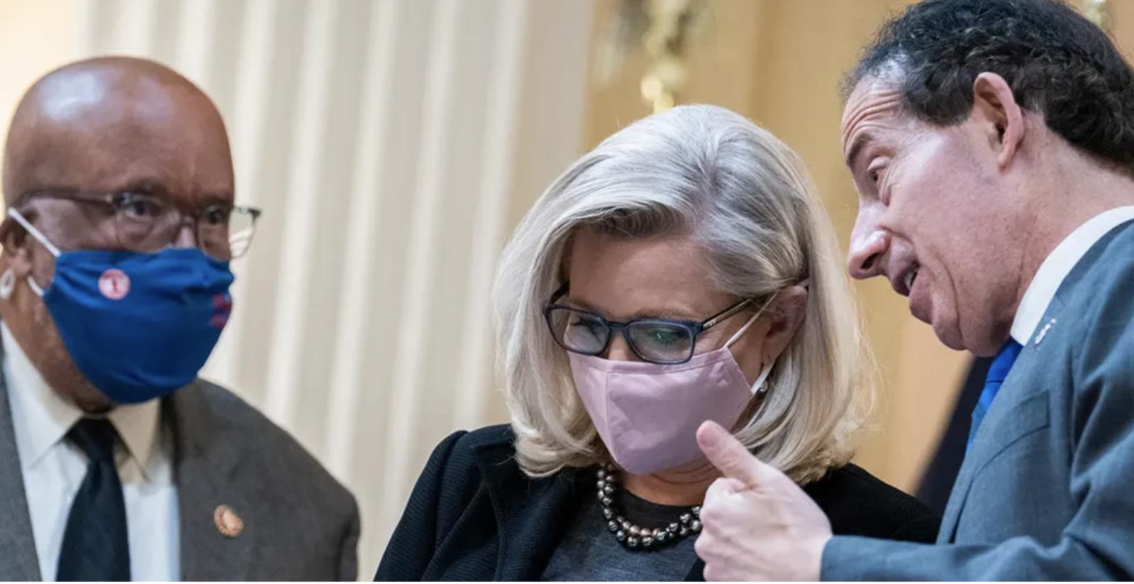 Nghị sĩ đảng Dân chủ Liz Cheney (giữa), Nghị sĩ Jamie Raskin (phải) và Bennie Thompson trao đổi tại cuộc họp của Uỷ ban Điều tra vụ bạo loạn 6/1. Ảnh: Getty Images