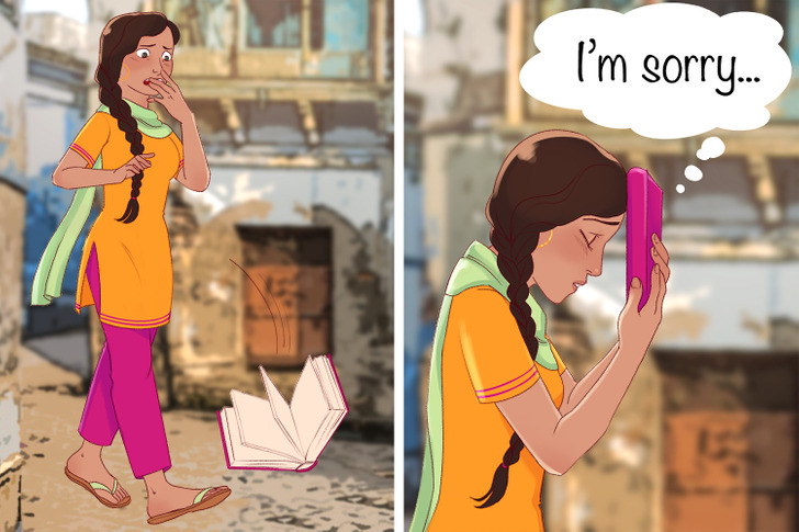 Ở Ấn Độ, trẻ em được dạy từ nhỏ rằng, sách là kiến thức. Người dân thậm chí còn thờ phụng Nữ thần Học tập Saraswati. Vì vậy, việc chạm chân vào sách hoặc thậm chí đá vào cặp sách đều được cho là hành vi thiếu tôn trọng.