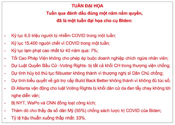Cụ Biden đã khai thác quá trớn đại dịch để rồi bây giờ lãnh đủ đại nạn khi chẳng những không kềm chế được đại dịch, mà lại bị dịch tấn công mạnh hơn xa dưới thời TT Trump. Trong một năm Trump khi chưa có thuốc trị cũng như thuốc ngừa, số người bị nhiễm là hơn 25 triệu; một năm dưới Biden, với đủ loại thuốc trị và thuốc ngừa, sau khi chính quyền và các bác sĩ học hỏi được kinh nghiệm đánh COVID trong cả năm trời, số người bị nhiễm lên tới trên 40 triệu, nhiều gấp rưỡi dưới thời Trump.