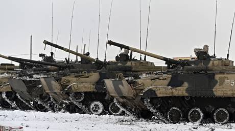 Xe bọc thép trong một cuộc tập trận ở Vùng Rostov, Nga, ngày 27/1/2022. Ảnh Sputnik