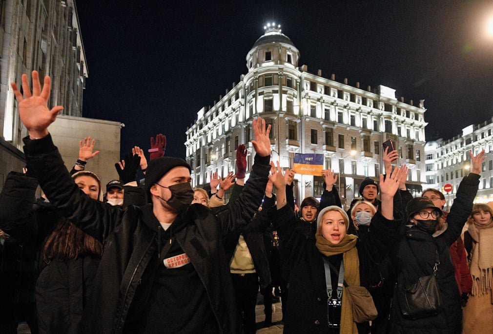 Trên quảng trường Puskin ở thủ đô Moscow, hàng trăm người tập trung biểu tình với thông điệp "Nói không với chiến tranh". Hình ảnh tương tự được ghi nhận tại St. Petersburg, thành phố lớn thứ hai cả nước.