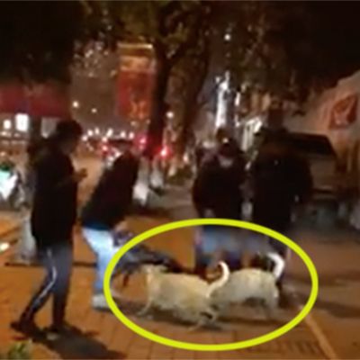 Nhiều thành viên mạng chia sẻ đoạn clip ghi lại cảnh ồn ào trên phố. Khi có một nhóm người đang cố sức can ngăn hai con chó vàng đang cố lao vào một con chó khác (màu đen). Được chủ nhân là cô gái dẫn đi dạo.