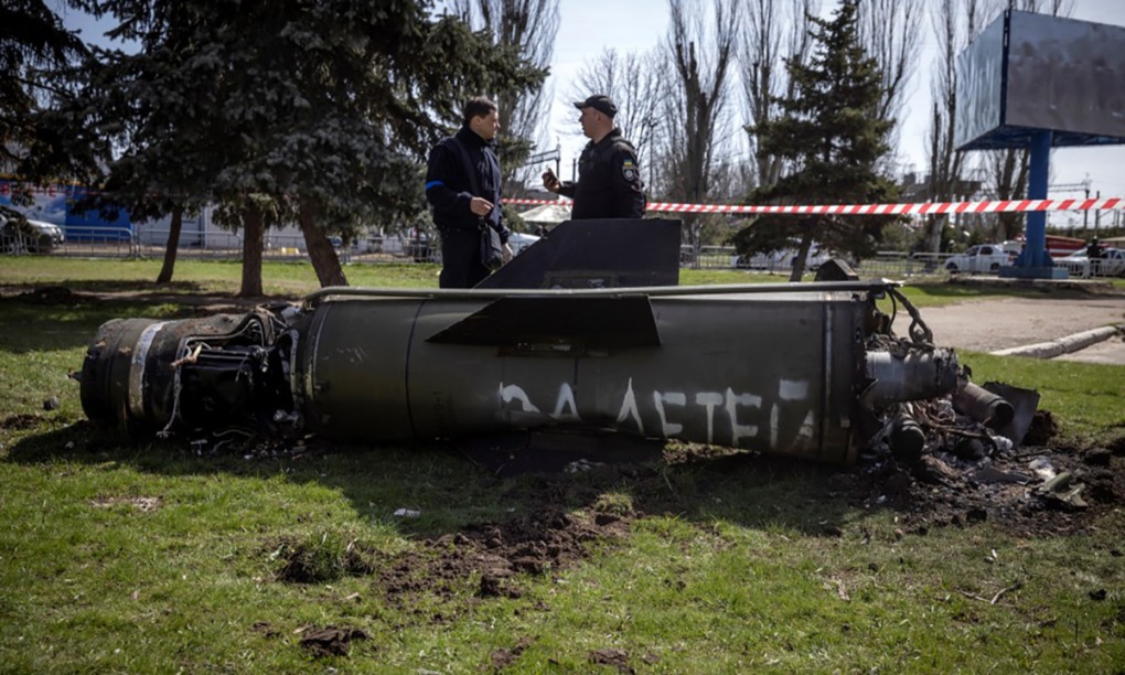 Một phần tên lửa trên bãi cỏ gần ga tàu Kramatorsk, Ukraine ngày 8/4. Ảnh: AFP.
