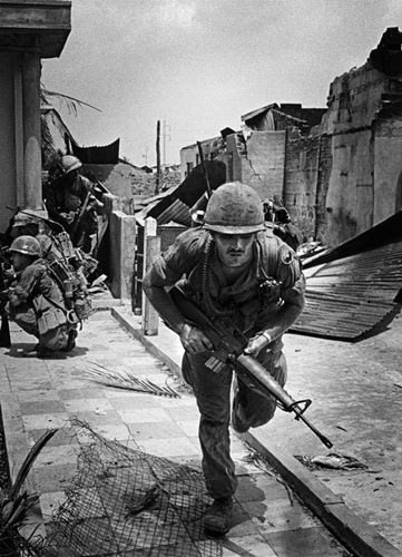 Lính Mỹ thuộc Sư đoàn bộ binh số 9 tác chiến trên đường phố Sài Gòn, trong chiến sự Mậu Thân 1968. Ảnh: Philip Jones Griffiths/Magnum.