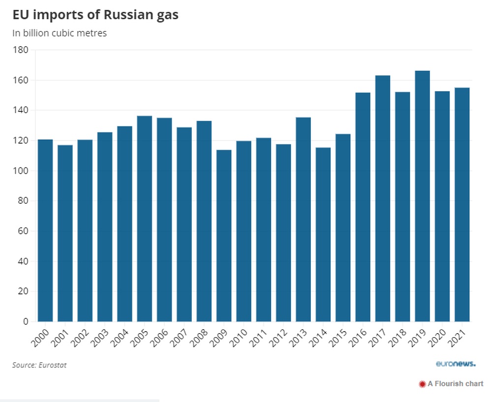 Nga là nhà cung cấp khí đốt chính của EU, chiếm 45% tổng nguồn cung cấp khí đốt - 155 tỷ mét khối (bcm) - vào năm 2021.