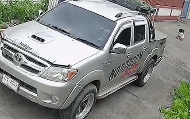 Do không biết bé trai đang ngồi giữa đường nên tài xế vẫn cho lùi xe. Cứ vậy chiếc xe đã cuốn cậu bé vào gầm.