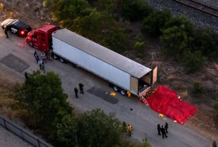 Chiếc xe container 18 bánh chứa thi thể người di cư bị bỏ lại ở phía tây nam thành phố San Antonio hôm 27/6. Một công nhân làm việc gần hiện trường nghe thấy tiếng kêu cứu phát ra từ chiếc xe và đã báo cảnh sát.