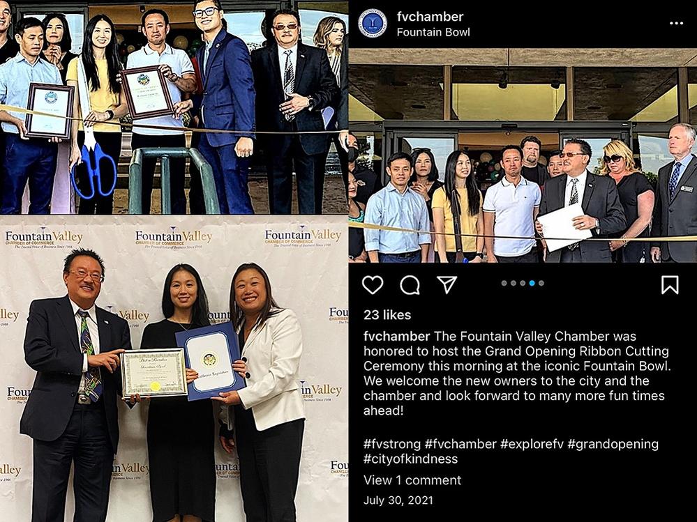 Thị Trưởng Fountain Valley - ông Michael Võ trao giấy phép kinh doanh cho doanh nhân Quốc Phan trong ngày cắt băng khánh thành Fountain Bowl