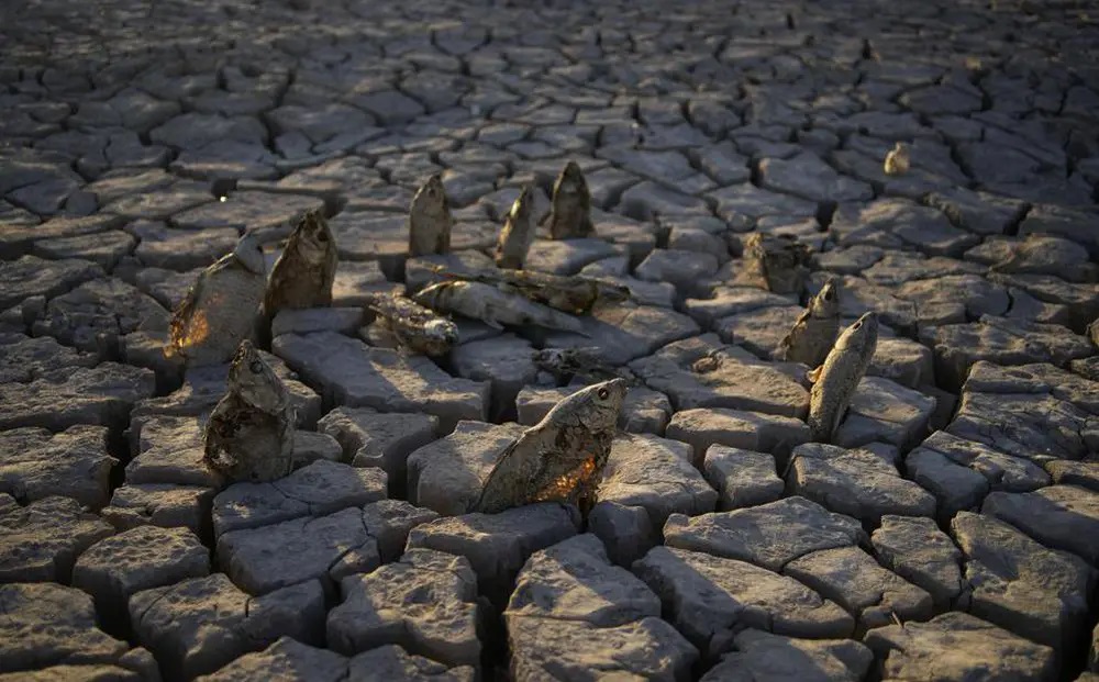 Đáy hồ khô trông giống như thủy tinh vỡ, các vết nứt trơ trơ dưới nắng nóng. Một đàn cá chết được người ta cắm xuống mặt hồ, xếp thành một vòng tròn.