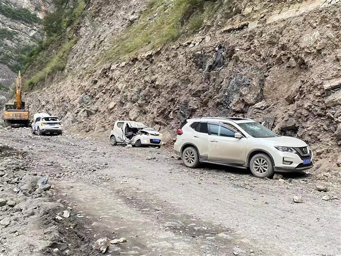 Xe ôtô bị hư hại sau trận động đất mạnh 6,1 độ tại Yaan, tỉnh Tứ Xuyên (Trung Quốc), ngày 2/6/2022. (Ảnh: AFP/TTXVN)