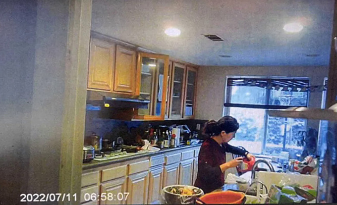 Ảnh chụp màn hình cho thấy Yu ở trong bếp, đổ thứ gì đó ra từ bình nhựa màu cam. Chen nói đó là dung dịch Drano. Ảnh: Mercurynews