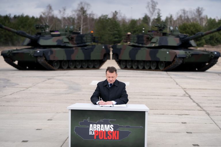 Bộ trưởng Quốc phòng Ba Lan Mariusz Blaszczak trong lễ ký hợp đồng mua 250 xe tăng Abrams cho Lữ đoàn Thiết giáp Warsaw số 1 của Quân đội Ba Lan.