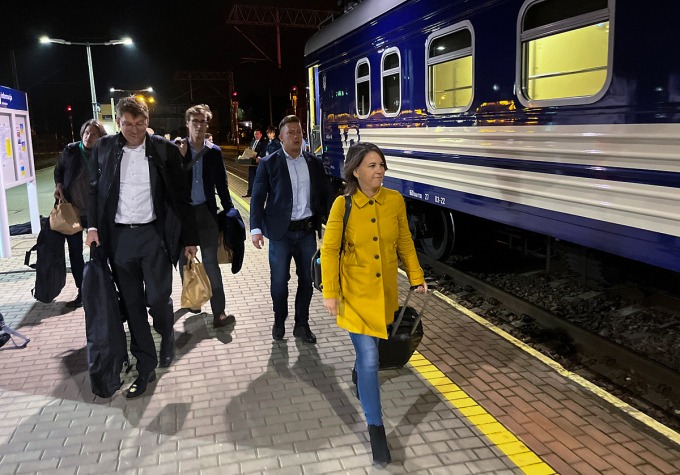 Ngoại trưởng Đức Annalena Baerbock (áo vàng) cùng các quan chức tháp tùng lên tàu tới Kiev, Ukraine ngày 10/9. Ảnh: AFP.