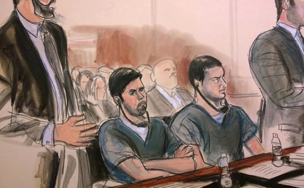 Hình ký họa trong phòng xử hai cháu trai của đệ nhất phu nhân Venezuela (giữa) tại một tòa án ở New York tháng 12-2017 - Ảnh: AP