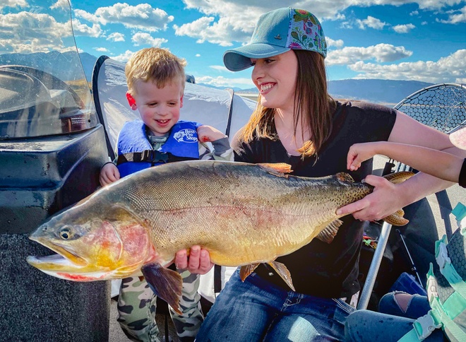 Hailey Thomas và con trai chụp hình lưu niệm với con cá hồi vân. Ảnh: Idaho Department of Fish and Game.