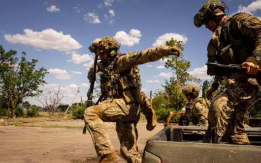 Các quân nhân Ukraine nhảy từ phía sau một chiếc xe bán tải để vào vị trí của họ ở tiền tuyến. Ảnh Stuff