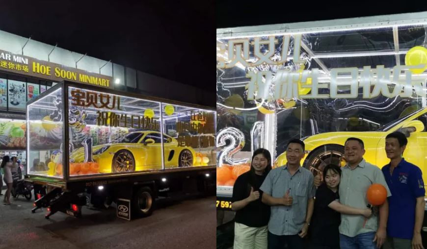 Khi chiếc Porsche được đưa đến nơi cô gái làm việc, tiếng nhạc chúc mừng sinh nhật bằng tiếng Trung và tiếng Anh vang lên, thu hút sự chú ý của mọi người.