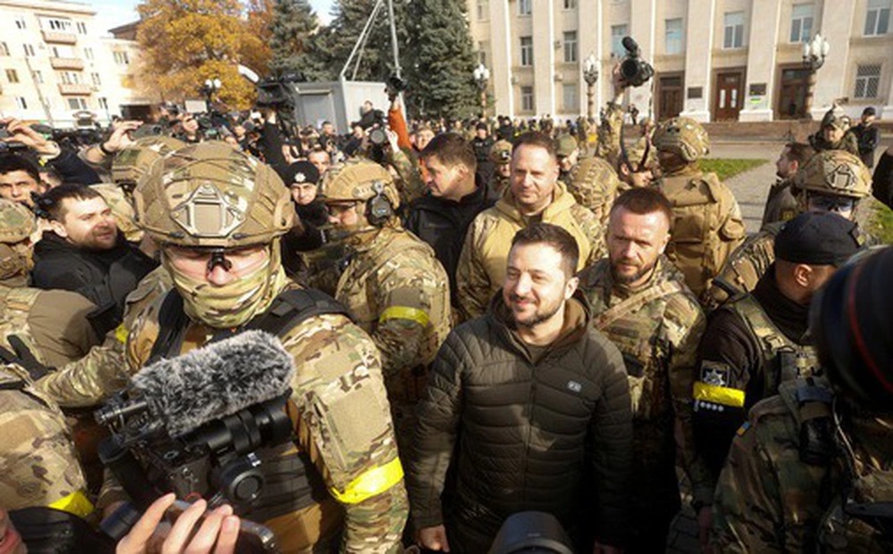Theo như vài ngày sau khi lực lượng Nga rút chạy khỏi thành phố Kherson sau nhiều tháng chiếm đóng thành phố này, đã được Tổng thống Ukraine Volodymyr Zelensky đến thăm Kherson và phát biểu trước quân đội.