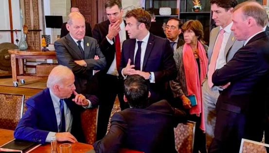 Thủ tướng Đức Olaf Scholz cùng với Tổng thống Mỹ Joe Biden, Tổng thống Pháp Emmanuel Macron, Thủ tướng Tây Ban Nha Pedro Sanchez, Thủ tướng Anh Rishi Sunak, Thủ tướng Canada Justin Trudeau và những người khác thảo luận tại Hội nghị thương đỉnh G20 ở Bali, Indonesia. Ảnh Reuters.