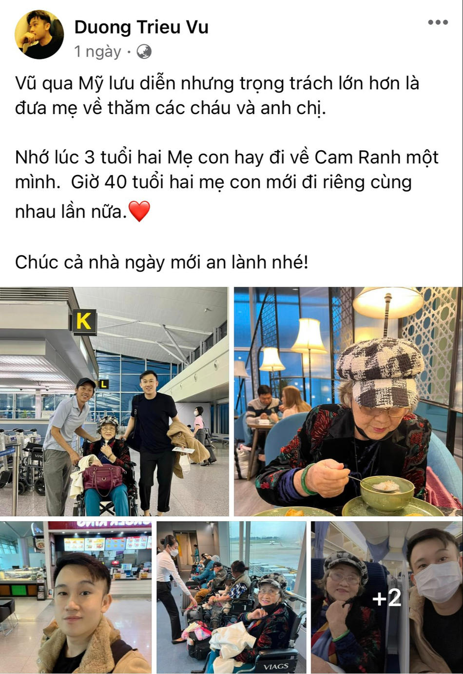 Hôm qua (22/11), ca sĩ Dương Triệu Vũ, em trai danh hài Hoài Linh chia sẻ loạt ảnh tiễn mẹ về Mỹ. Nam ca sĩ bộc bạch trên trang cá nhân: "Vũ qua Mỹ lưu diễn nhưng trọng trách lớn hơn là đưa mẹ về thăm các cháu và anh chị. Nhớ lúc 3 tuổi hai mẹ con hay đi về Cam Ranh một mình. Giờ 40 tuổi hai mẹ con mới đi cùng nhau lần nữa. Chúc cả nhà ngày mới an lành nhé".