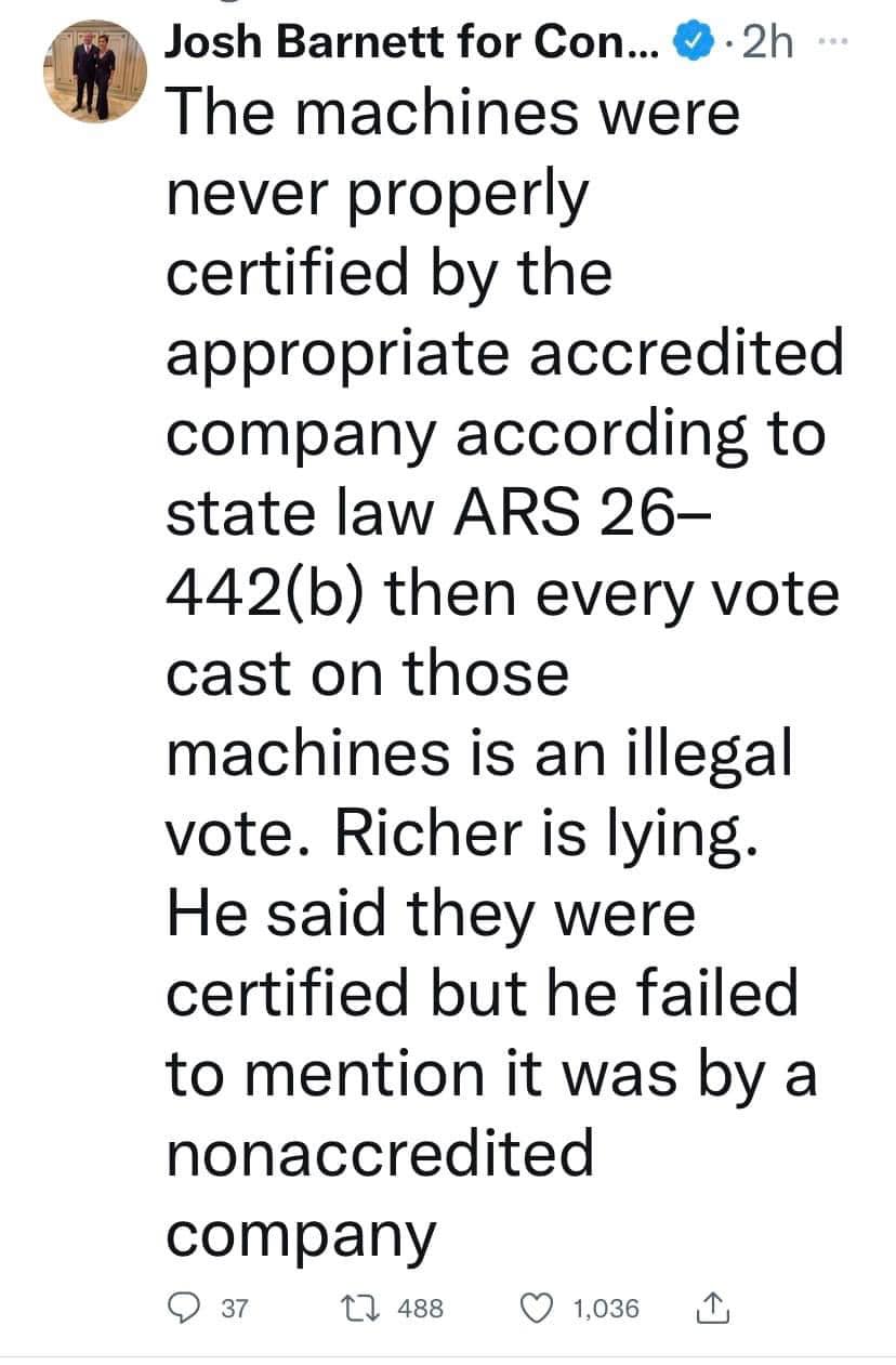 -Bộ tư pháp tiểu bang Arizona từ chối xác nhận kết quả bầu cử vì nhiều bằng chứng gian lận. Tiểu bang Arizona có thể bầu cử lại vì các máy đếm phiếu không được chứng nhận.