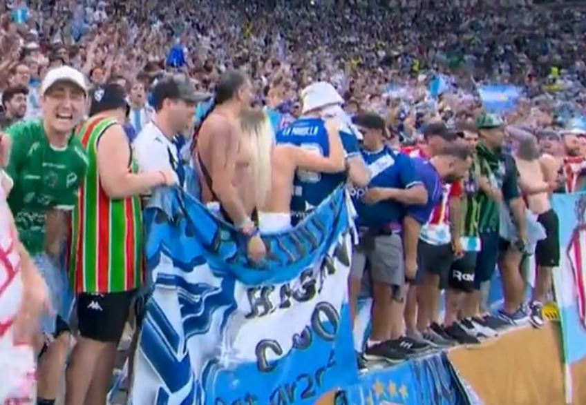 Sau cú sút quyết định của Gonzalo Montinel, máy quay hướng về phía cổ động viên Argentina đang cổ vũ rực lửa. Trong số đó có một người phụ nữ tóc vàng để ngực trần ăn mừng chiến thắng.