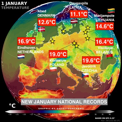 Ở Korbielów, Ba Lan, nhiệt độ lên tới 19 độ C, mức nhiệt thường ghi nhận vào tháng 5, và cao hơn 18 độ C so với mức trung bình 1 độ C vào tháng 1 hàng năm ở đây. Tại Javorník, cộng hòa Czech, mức nhiệt ghi nhận là 19,6 độ C, cao hơn so với mức trung bình 3 độ C vào thời gian này trong năm.